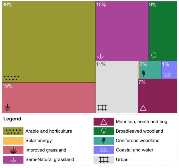 Percentages of England’s total land area occupied by different types of land use (derived from Natural England’s Living England project)