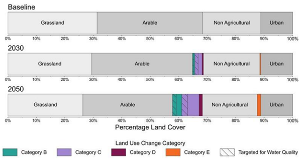 Estimated type and extent of land use change needed as a percentage of England’s total area to 2030 and 2050