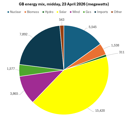 Another solar generation record of 14,426 megawatts was set at 11.30 on 22 April, delivering 37% of Great Britain’s electricity and contributing to a record low reliance on fossil fuels. According to figures from the National Energy System Operator, natural gas accounted for exactly 2% of Great Britain’s electricity supplies at 11.30 and at midday, generating a comparatively tiny 799MW.[1]